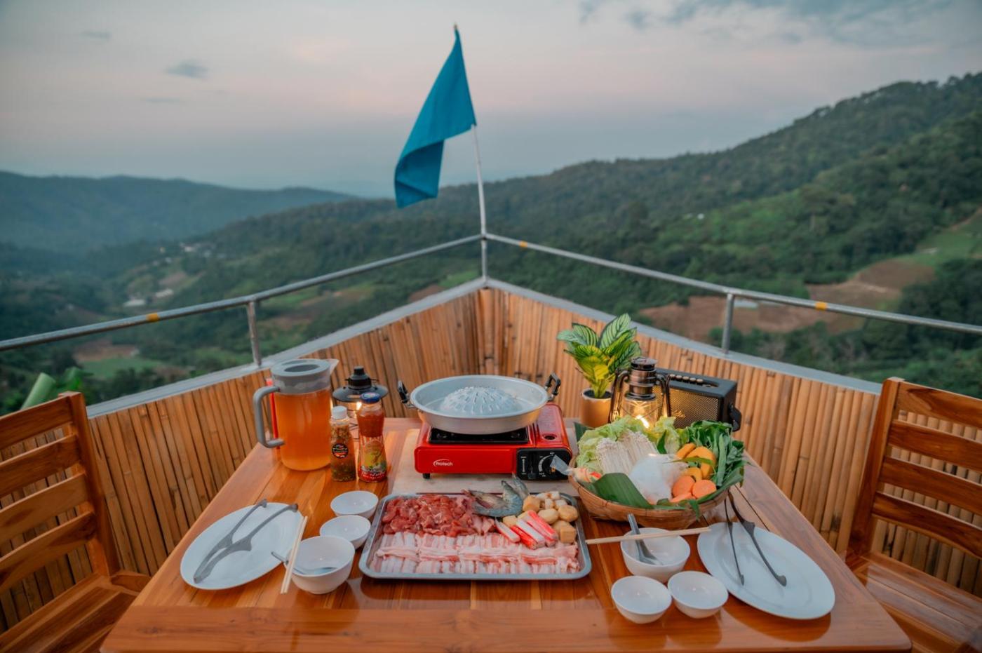Guests can enjoy a meal on an outdoor dining area while overlooking the mountain views.